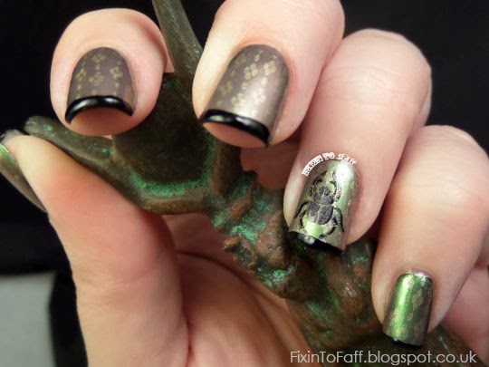 Then over the center of my accent ring finger, I stamped the scarab beetle from the MoYou Explorer 02 (he's in the middle of his own pattern, which I just wiped off the stamper with a cotton swab dipped in acetone) using Maybelline Blackout.