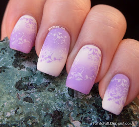 I began by applying bases of white and the lilac on alternating nails. I am highly impressed with the MoYou stamping polish, because it applied easily to the nail as a one-coat wonder, with none of the goopiness I have come to associate with stamping polishes. As you can see, I've done a two-color sponge gradient, alternating directions from one nail to the next. I followed this by stamping the corner floral image from the plate twice on each nail, in the reverse color to the base. It's the same stamp image, just turned upside down.