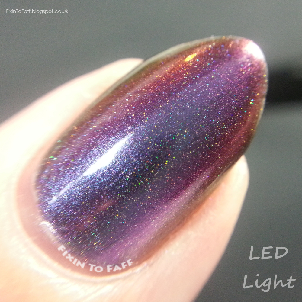 To really show off the gorgeousness, though, you have to get this polish under full-spectrum lighting.  Since England is notoriously stingy with the sunlight, I snapped the remaining pics under my LED light, so you can really see the chromes come alive, and the holographic flash!